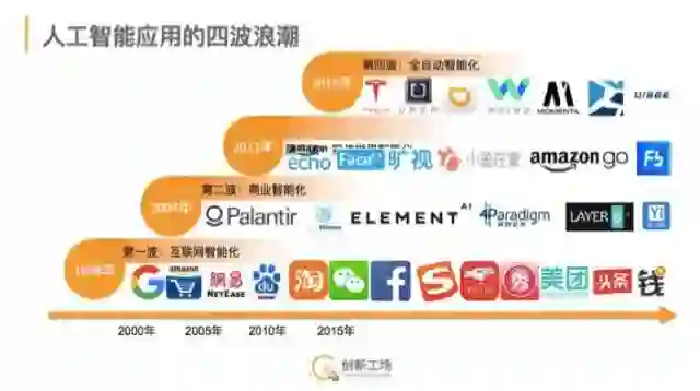 创新工场分析认为,人工智能有4波浪潮。之所以称之为浪潮是因为它们同时发生、没有先后顺序,并且都会带来巨大的商机。第一波是互联网AI化、第二波是商业AI化、第三波是实体世界感知AI化,最后是全自动AI化。
