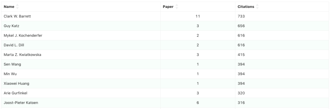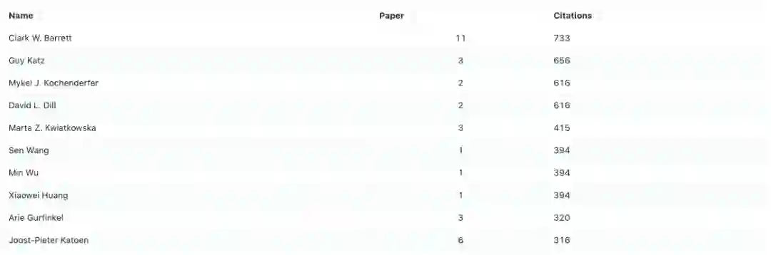 2. Safety Verification of Deep Neural Networks 作者:Xiaowei Huang, Marta Kwiatkowska, Sen Wang, Min Wu 被引用量:394 引用量排名前二的论文均是对神经网络的防御、验证问题的探讨。高引 No.1 的论文来自斯坦福大学,论文提出了一种用于神经网络错误检测的新算法 Reluplex。Reluplex 将线性编程技术与 SMT(可满足性模块理论)求解技术相结合,其中神经网络被编码为线性算术约束。论文的核心观点就是避免数学逻辑永远不会发生的测试路径,这允许测试比以前更大的数量级的神经网络。Reluplex 可以在一系列输入上证明神经网络的属性,可以测量可以产生虚假结果的最小或阈值对抗性信号。高引 No.2 的论文来自牛津大学,论文也是提出希望基于可满足性模理论对神经网络的鲁棒性做一些验证。 3. A storm is Coming: A Modern Probabilistic Model Checker 作者:Christian Dehnert, Sebastian Junges, Joost-Pieter Katoen, Matthias Volk被引用量:194 4. The SeaHorn Verification Framework 作者:Arie Gurfinkel, Temesghen Kahsai, Anvesh Komuravelli, Jorge A. Navas被引用量:170 5. SMT-Based Model Checking for Recursive Programs 作者:Anvesh Komuravelli, Arie Gurfinkel, Sagar Chaki被引用量:136 6. PROPhESY: A PRObabilistic ParamEter SYnthesis Tool 作者:Christian Dehnert, Sebastian Junges, Nils Jansen,Florian Corzilius, Matthias Volk,Harold Bruintjes, Joost-Pieter Katoen, Erika Ábrahám被引用量:96 7. OptiMathSAT: A Tool for Optimization Modulo Theories 作者:Roberto Sebastiani, Patrick Trentin被引用量:90 8. From Invariant Checking to Invariant Inference Using Randomized Search 作者:Rahul Sharma, Alex Aiken被引用量:84 9. Algorithms for Model Checking HyperLTL and HyperCTL 作者:Bernd Finkbeiner, Markus N. Rabe, César Sánchez被引用量:83 10. Qlose: Program Repair with Quantitative Objectives 作者:Loris D'Antoni, Roopsha Samanta, Rishabh Singh 被引用量:74