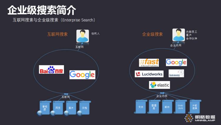 说到搜索,大家第一印象一般都是像百度、Google 这样的互联网搜索引擎,这些搜索引擎主要通过网络爬虫抓取互联网上的数据,比如网页、图片、文档、音视频等,任何人都可以在上面输入关键词查询自己想要的信息;而另一方面,平时大家关注得比较少的企业搜索,则是对企业提供一整套的搜索技术方案,它们处理的数据大部分是来自于企业内网,形式上跟互联网搜索的数据不太一样,可能包含内部文档、邮件、数据库、第三方办公软件,当然也可以包括外部的数据,而企业搜索的用户一般也只能在企业内网里使用这些搜索服务。