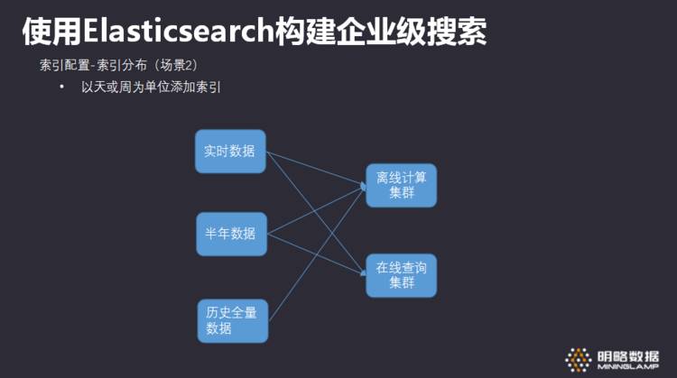 第二个例子是,对于数据规模不稳定且随时间增长的场景,可以以一天或一周为单位创建索引(根据具体需求而定),而且往往可以把实时 / 在线的数据索引存放在在线查询集群里,而历史的全量数据进行存放在离线计算集群,一般来说在线查询集群保留半年或一年内的数据,并可以使用更高端的配置(如 SSD)进行加速。