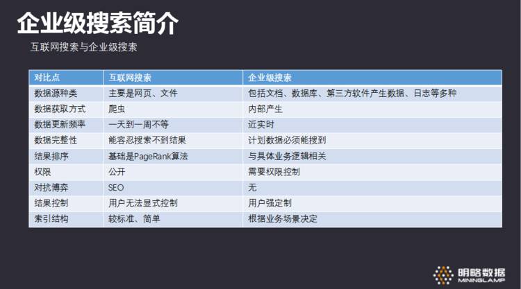 权限:企业级搜索经常需要进行严格的权限控制,不该让用户看到的数据不能显示,而互联网搜索没有限制,即使有也是由于政策原因,与用户本身无关