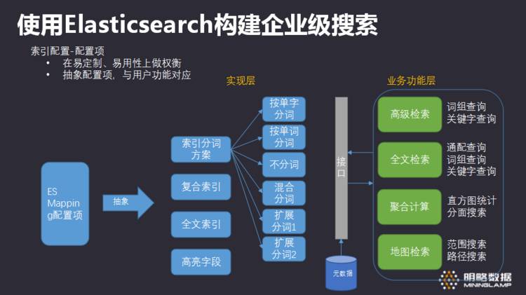 经过处理的干净数据如何构建索引是由索引配置和索引模块决定的,在索引配置中,用户可以指定数据字段与索引字段的对应关系以及每个索引字段的具体索引配置(比如分词器等),而索引模块则根据索引字段的元属性创建 Elasticsearch 或 Solr 的索引配置,并根据索引配置为数据指定一个索引进行写入操作,还有索引别名的管理等等