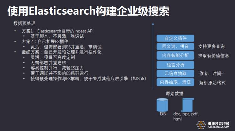 在预处理的过程里,我们预设了几种可用的处理插件,比如解析原始数据内容(比如文本内容抽取)、数据清洗操作(比如去重)、语言分析(识别数据所使用的语言种类)、通过 NLP 模块提取更有价值的信息,进行同义词扩展和拼音扩展等。在特定的业务场景里,项目人员也可以通过定制新的插件为索引的内容增加新的丰富信息。