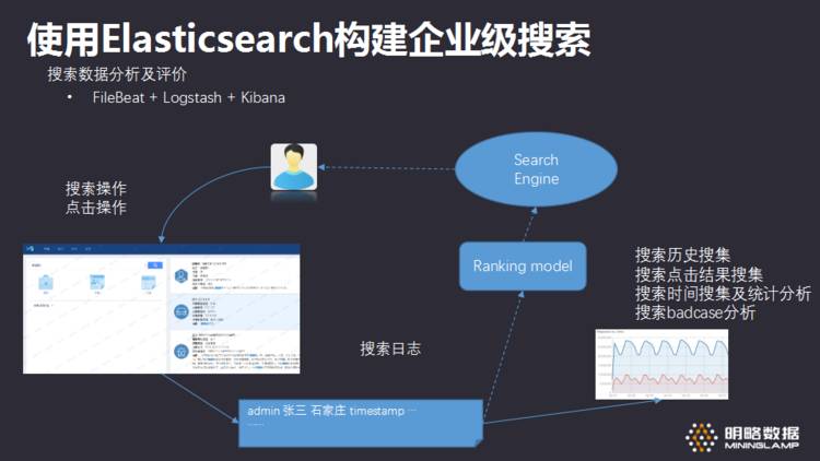 为了优化搜索效果,我们除了直接收集用户的评价之外,还需要通过程序化的方式收集用户的反馈,这属于搜索管理的一部分。通过结合 FileBeat、Logstash 和 Kibana,我们可以及时收集用户使用搜索的日志数据,并通过 kibana 的图形界面进行搜索点击结果的统计、性能的分析、badcase 的分析等等,通过分析日志可以改善我们的排序逻辑并形成正反馈。