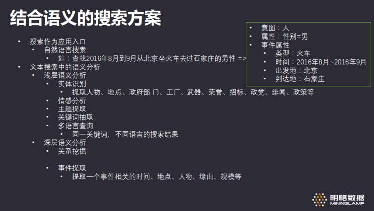 答:我这里提到的语义,一方面是理解用户输入的内容从而自动地完成一个复杂的查询过程,另一方面是挖掘到数据里细粒度的有价值信息以及它们之间的关联; 2. 我们的语义模型更多的是 offline training。