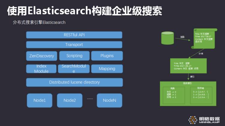 Elasticsearch(常简称 ES)是一个基于 Apache Lucene 的分布式搜索引擎,左边是 ES 大体上的架构,它在 Lucene 支持的功能之上,提供了在节点管理、节点发现、建索引、查询的功能,并提供了用户友好的 REST API。