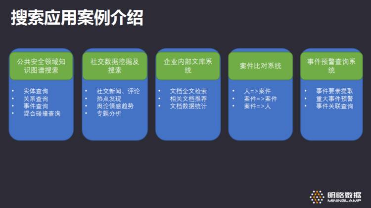 在公共安全领域,我们使用搜索来满足用户对知识图谱中的实体、关系和事件的查询,并支持多类数据的混合碰撞分析,前面提到的自然语言搜索就是在这个领域得到了较好的应用,因为数据本身比较复杂。而在社交分析领域,我们主要使用 ES 进行较多的数据聚合分析,前提也是做了比较多的浅层和深层语义分析;更常见的是,企业客户内部需要以搜索的方式查找内部的文档或者获取相关的文档内容。此外,在我们重点关注的公共安全领域,我们还通过搜索服务实现从人到案件,从案件到人,从案件到案件的案件比对系统,以及事件预警系统,给业务人员推荐有重点嫌疑的人和事。