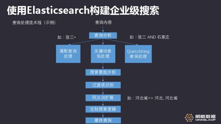 这里举了一个流水线的实例,首先查询内容经过语法分析,会分别分派到不同的处理器上进行处理,比如关键词中包含 * 或? 的字眼,我们会使用通配查询,对于包含逻辑操作符的查询我们会使用 QueryString 查询;