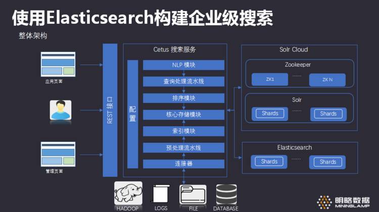 为了支持更多的业务场景,我们搭建了这样一套企业级搜索服务的整体架构:首先大家看右侧,是我们底层对接的搜索引擎,目前主要是 Elasticsearch,当然也正在接入 Solr Cloud。