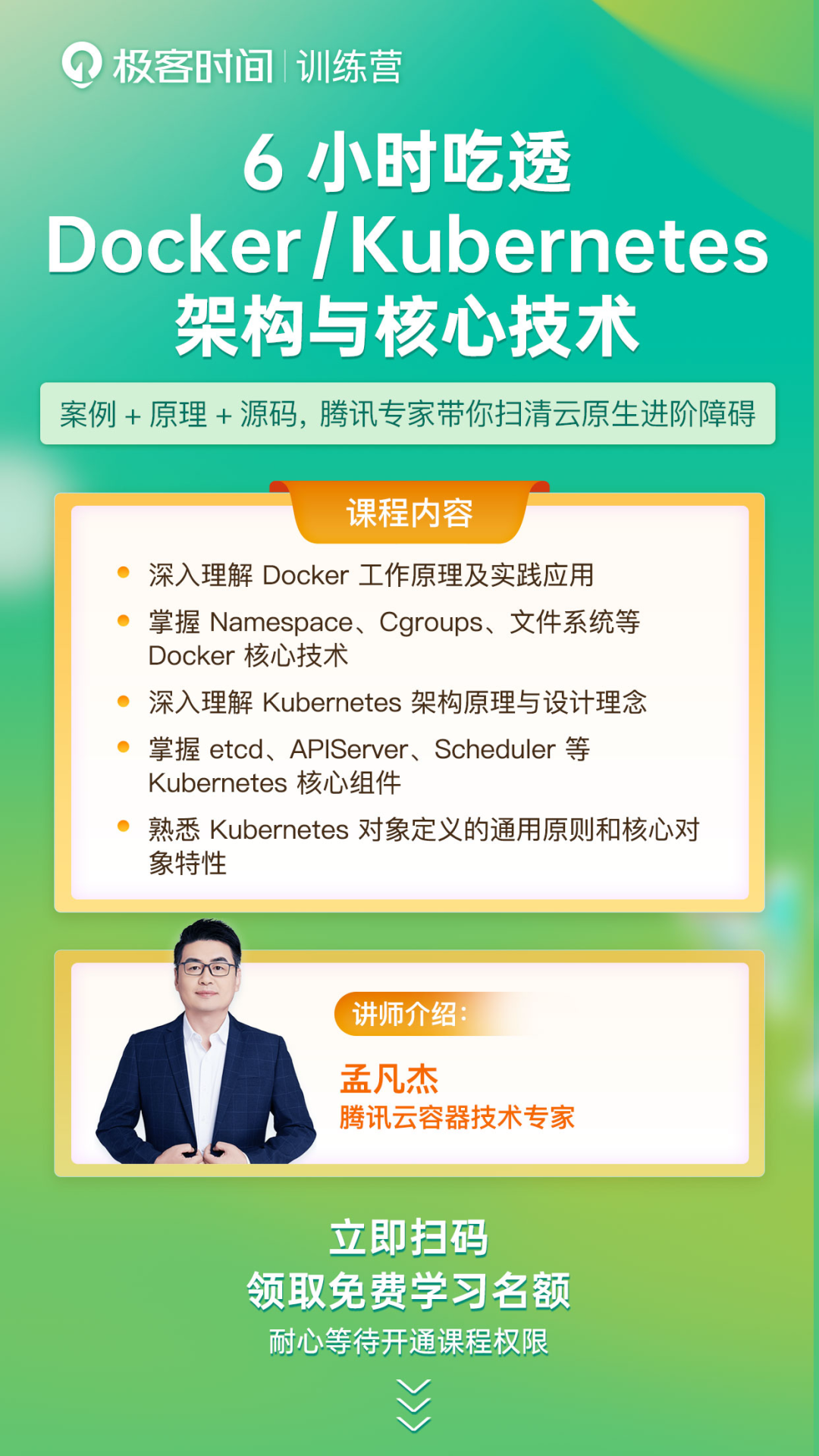 今天就给你推荐一个超牛的云原生进阶课:6 小时吃透 Docker/Kubernetes 架构与核心技术,来自腾讯云的容器技术专家孟凡杰,带你从案例到原理再到源码,由浅入深,扫清 Docker/Kubernetes 技术进阶中的重难点。