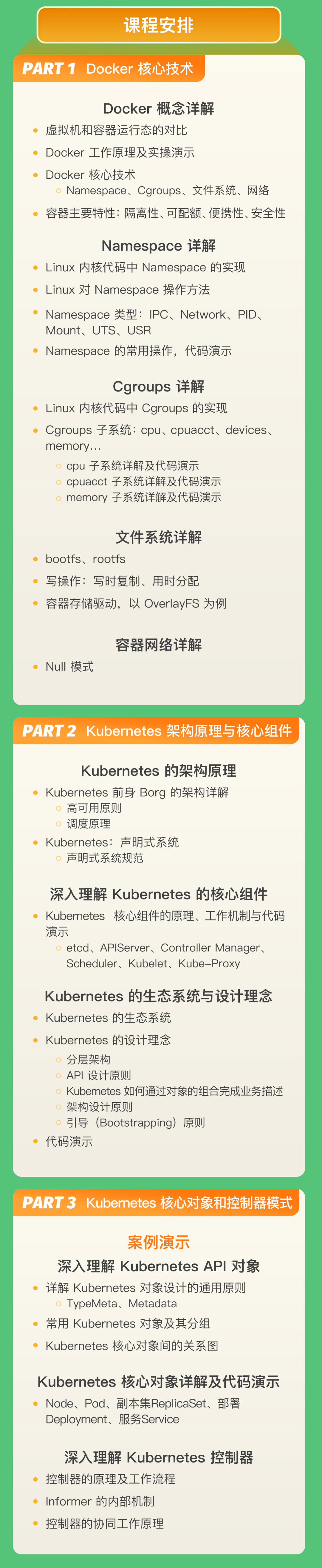 Namespace、Cgroups、文件系统、etcd、APIServer、Controller Manager、Scheduler、Kubelet、Kube-Proxy 等核心技术和组件全部覆盖。