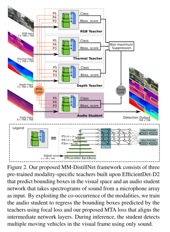 摘要:目标固有的声音属性可以提供有价值的线索,以学习丰富的表示形式来进行目标检测和跟踪。此外,可以通过仅监视环境中的声音来利用视频中视听事件的共现来在图像上定位目标。到目前为止,这仅在摄像机静止且用于单个目标检测的情况下才可行。此外,这些方法的鲁棒性受到限制,因为它们主要依赖于高度易受光照和天气变化影响的RGB图像。在这项工作中,我们提出了一种新颖的自监督的MM-DistillNet框架,该框架由多名教师组成,这些教师利用RGB,深度和热图像等多种模式,同时利用互补线索和提炼知识到单个音频学生网络中。我们提出了新的MTA损失函数,该函数有助于以自监督的方式从多模态教师中提取信息。此外,我们为有声读物的学生提出了一种新颖的自监督的前置任务,使我们不必依赖劳动强度大的人工注释。我们引入了一个大型多模态数据集,其中包含113,000多个时间同步的RGB,深度,热和音频模态帧。大量实验表明,我们的方法优于最新方法,同时能够在推理甚至移动过程中仅使用声音来检测多个目标。