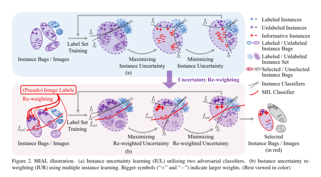 摘要:尽管主动学习(active learning)在图像识别方面取得了长足的进步,但仍然缺乏为目标检测任务设置的实例级主动学习方法。在本文中,我们提出了多实例主动学习(MIAL),通过观察实例级别的不确定性来选择信息量最大的图像进行检测器训练。MIAL定义了实例不确定性学习模块,该模块利用在标记集上训练的两个对抗性实例分类器的差异来预测未标记集的实例不确定性。MIAL将未标记的图像视为实例包,并将图像中的特征锚视为实例,并通过以多实例学习(MIL)方式对实例重新加权来估计图像不确定性。迭代实例不确定性学习和重新加权有助于抑制嘈杂的实例,以弥合实例不确定性和图像级不确定性之间的差距。实验证明,MIAL为实例级的主动学习设置了坚实的基准。在常用的目标检测数据集上,MIAL具有明显的优势,优于最新方法,尤其是在标记集很小的情况下。