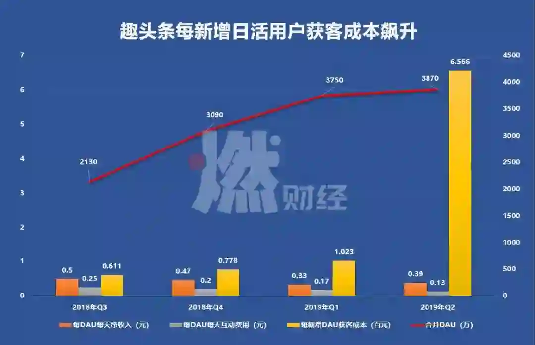 另一方面,趣头条的投入还在继续保持。根据燃财经的计算,近四个季度,趣头条每新安装用户获取费用在6-7元,基本保持稳定,但每新增日活用户的获客成本飙升,分别为61.1元、77.8元、102.3元和656.6元。