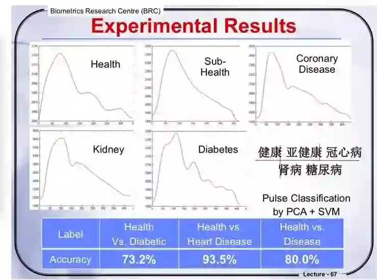 第三个是触觉感知,我们按照中医的三部九侯思路设计了相应系统。鉴于脉象是血流通过内脏器官流到人的末梢,带有内脏器官的病理信息,因此我们一直坚定脉象无法被ECG取代。我们通过生物特征识别技术对大量特征进行提取,然后进行优化,最终形成了对不同波形的分析。