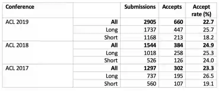 鉴于提交的论文数量创下了新纪录,ACL 2019 的评选过程竞争非常激烈。在提交的 2906 篇论文中(包括撤回论文 120 篇及被拒论文 92 篇,最终有效投稿 2694 篇),最终有 660 篇论文被本次会议收录,总体接收率为 22.7%。该接收率比 ACL 2018(24.9%)和 ACL 2017(23.3%)的接收率略低,但考虑到 ACL 2019 比 ACL 2018 有效投稿论文数量增加了 75%,因而严格来说,这两年的论文接收率是非常接近的。同时,在 660 篇接收论文中,有 447 篇长论文和 213 篇短论文。与往年一样,长论文的接收率明显更高(25.7% VS 18.2%),再次表明相比长论文而言,短论文更难被接收。具体如下: