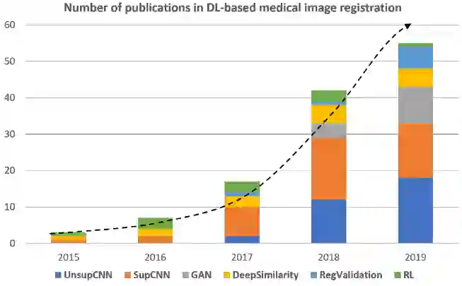 图2. 基于深度学习的医学图像配准中出版的文章数量。虚线表示近年来人们对基于深度学习的配准方法越来越感兴趣。“ DeepSimilarity”是在传统配准框架中使用基于DL的相似性度量的类别。“ RegValidation”代表使用DL进行配准验证的类别。