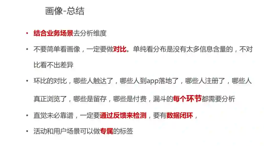 重点是结合业务,构建闭环,用数据来提升业务理解,通过业务理解来快速构建画像相关的数据体系。