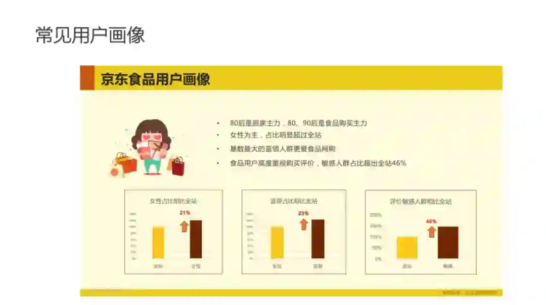 比较常见的画像是我们需要建立平台客户群体化认知时,我们需要借助可视化的标签,我们看一下京东的一个食品用户画像。对于食品这个业务场景,平台上购买的用户他们是长成什么样的?比如性别比例,蓝领与白领占比,评价敏感的人的占比等,通过拉平垂类偏好用户画像与全站的对比,来寻找差异点和优化点。