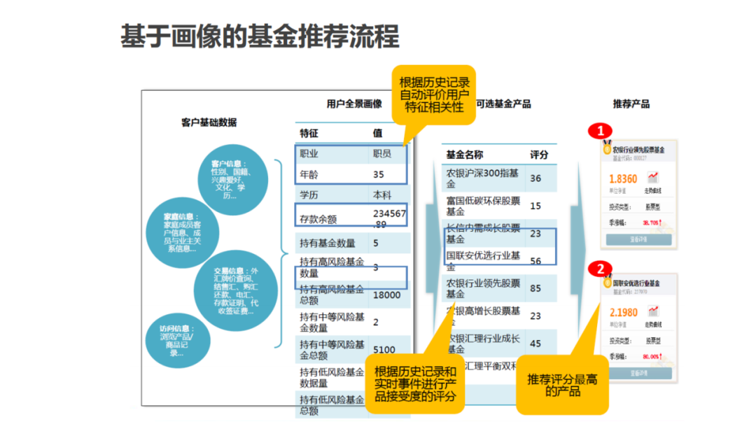 在看一个金融领域的应用案例,根据职业、年龄、存款等进行筛选,并结合历史理财的偏好等进行基金推荐。