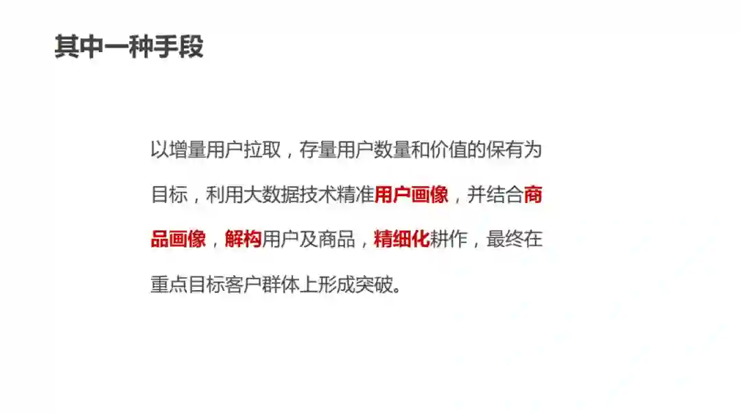 那其中的一个手段就是以增量用户拉取,存量用户数量和价值的保有为目标,利用大数据技术精准用户画像,并结合商品画像,解构用户及商品,精细化耕作,最终在重点目标客户群体上形成突破。比如电商猜你喜欢中的个性化推荐技术,万能的淘宝上有海量的商品几乎可以满足每个人的采购商品需求,但是如何让一个用户可以精准快速地找到是大问题,个性化是其根本,用户画像和塑造则是个性化的根本,希望可以让用户感受到产品为ta而造的满足感。