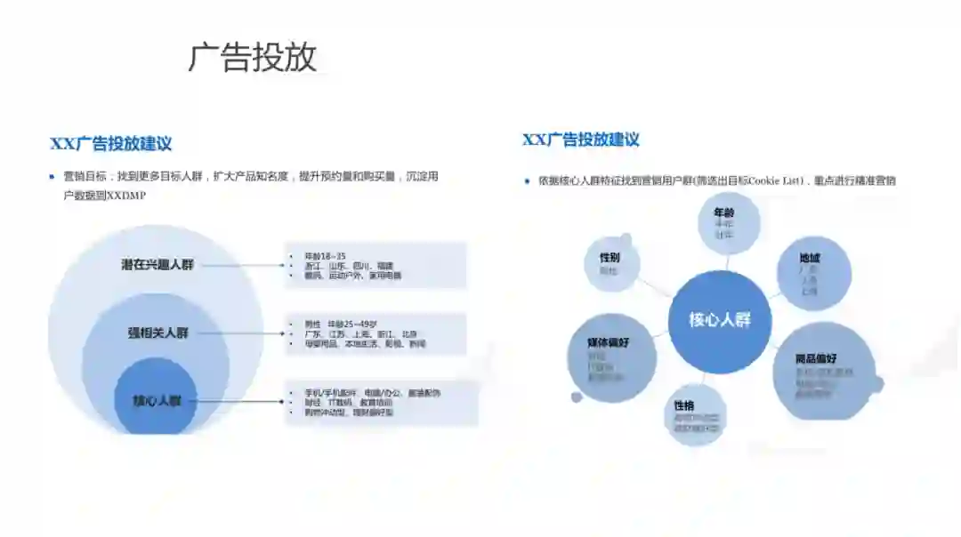 第一个我们介绍一下通过用户画像来做与竞品对比分析,在大维度战略调整和选择的时候,可以有差异化市场定位。根据用户标签进行市场细分和群画像分析,输出分析报告;帮助企业理解用户的人群特征、人生阶段、消费偏好等;帮助企业分析和友商用户群的异同,优化市场定位和差异化产品策略。这部分数据有自己内部的数据,竞品数据可以通过第三方等间接获取。