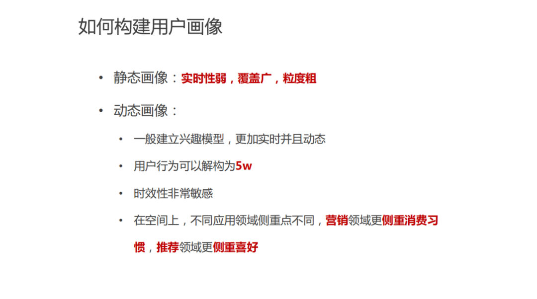 静态和动态的划分,其实是根据某个维度来定的,或者是在某个时间窗口内的。静态画像一般是实时性弱更新慢;动态画像变化相对更快一些,可以再时效性、空间上有差异。