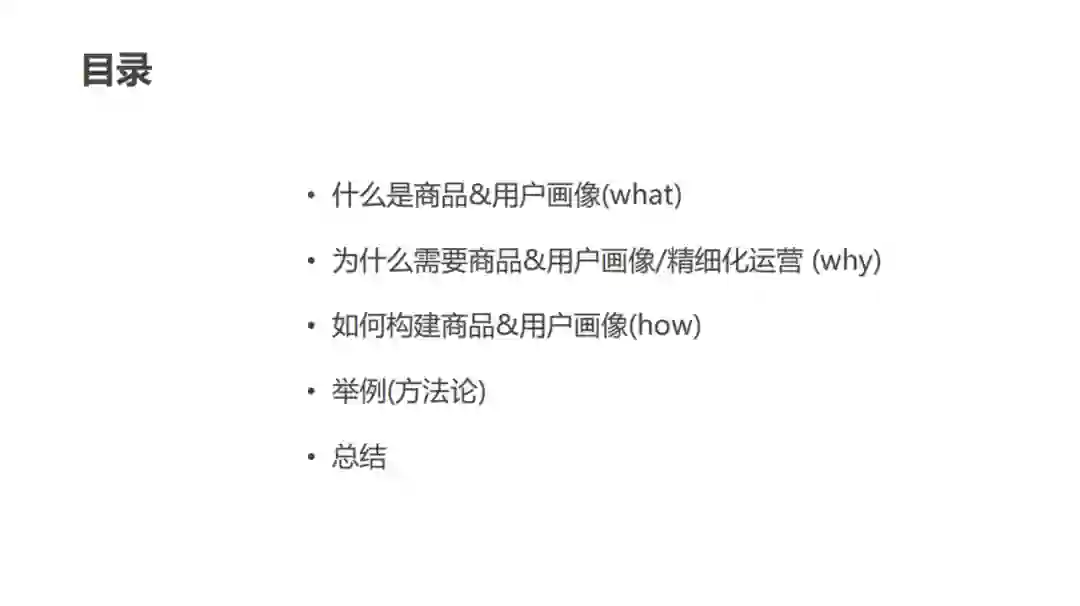 然后我们来看看目录,第一部分是说what,就是什么是用户画像;第二部分是说why,为什么我们需要用户画像以及精细化运营;然后第三部分是how,我们如何构建商品和用户画像;第四部分是举例,是一些方法论的介绍;最后,我们做一个整体的总结。