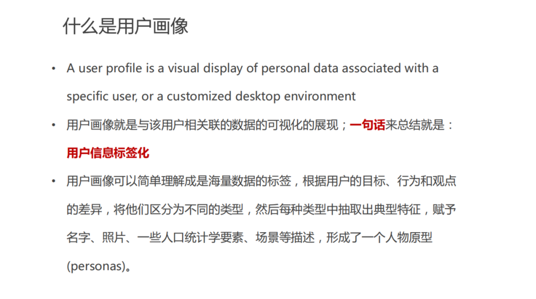 首先我们来看一下什么是用户画像,根据维基百科的定义,用户画像就是与该用户相关联的数据的可视化的展现,一句话来总结就是用户信息标签化。从用户海量的信息里面去找到一些标签,为用户去贴上这些标签,当然这些标签的来源就是一些用户的行为。