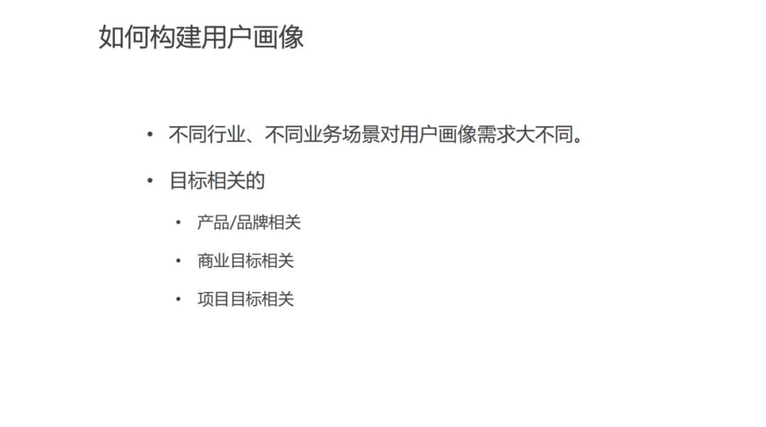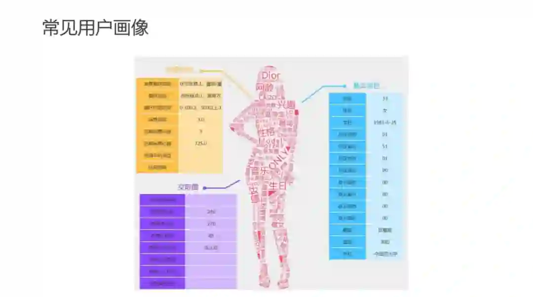 然后第二点,构建什么样的用户画像,比如说用户是男性还是女性,她工资多少,喜欢什么样的商品。这些标签可能是没有意义的,如果要说有意义的地方是这些标签如何去影响决策,如何为用户带来更好的体验,带来更高的留存、复购。