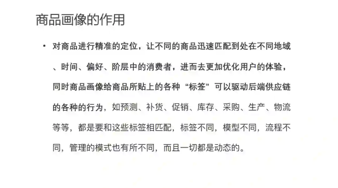 这里顺便讲一下商品画像的作用,商品画像的前台作用更多是在流量分发上与用户画像的match,关联后的一些推荐、精准推送等。比如用户标签为a类目的价格段偏好,然后商品画像也有价格段的标签,比如说用户偏好的是30-50人民币的连衣裙,然后这个商品是连衣裙并且正好是在30-50人民币的,所以可能相对其它价格段的商品而言,在这一维上更合理;接着再结合其它维度的商品和用户标签的match就可以构建更多的匹配维度。