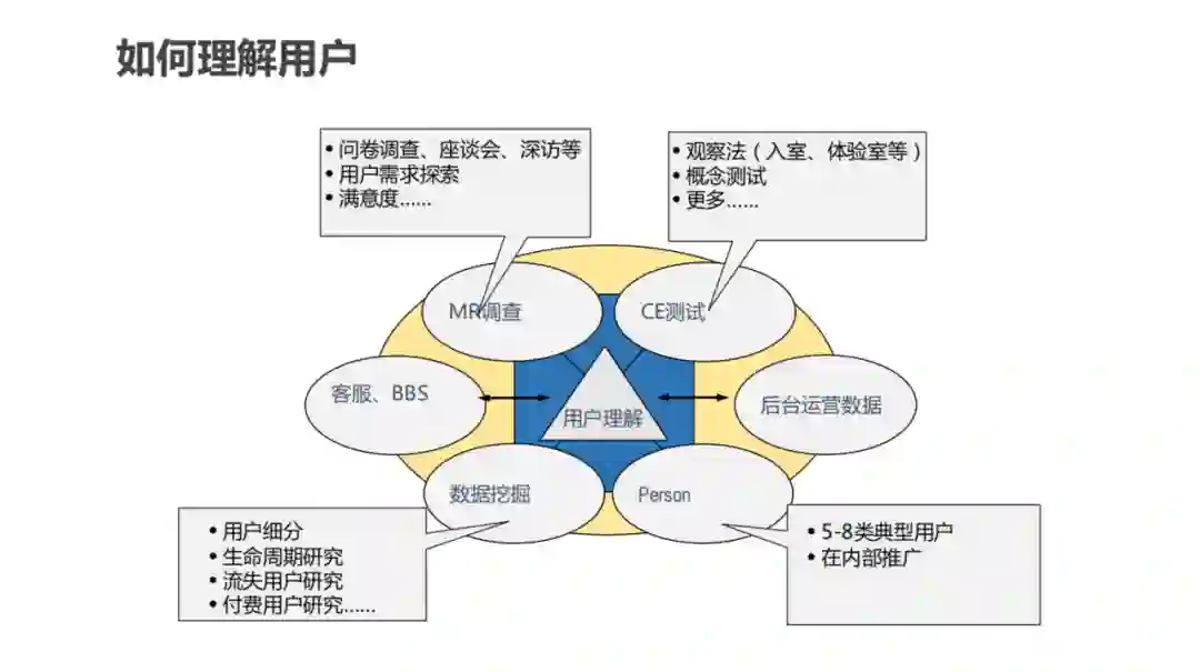 对于不同生命周期内的用户,其实数据和画像的丰富度也会有差异,在精细化运营过程中可以根据情况做差异化的运营。这里再讲一个其他案例,在用户分析维度,初期会通过用户调研访谈进行初期的产品定位,在投放扩量过程中,结合用户站内的情况作出效率分析,新用户有什么特征?核心的用户属性是否有变化?前后一年内获客可能会有很大差异,这种差异时常去关注,可能会了解到产品的变化是否符合预期。