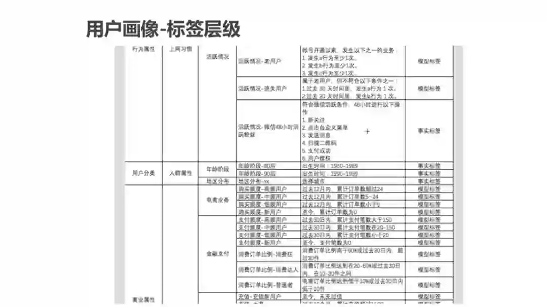 网上找了一个金融领域的例子,比如根据活跃情况,可以区分活跃用户和流失用户,再根据时间窗口维度可以拆为48小时活跃和不活跃用户。简单的统计就可以为用户贴上各类的标签,比如过去12个月内累计订单超过20次为界限,可以划分为高低频用户等。不过多展开,可以自行阅读上图。