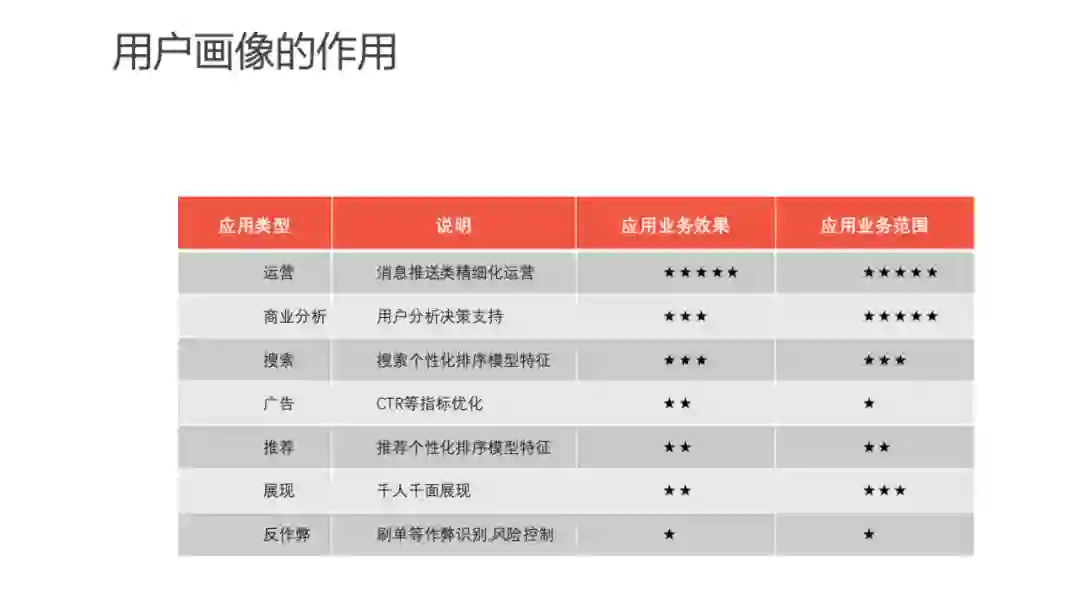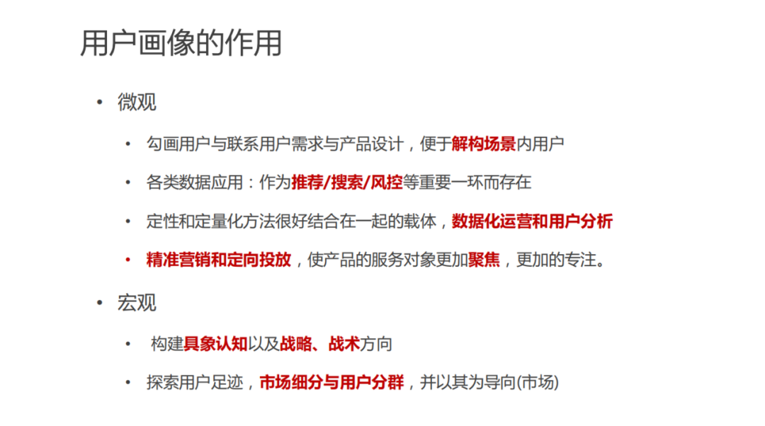 宏观和微观上我们看看画像的作用,微观上主要是精细化,比如推荐、搜索、精准营销、定向投放、风控、定量和定性的分析、数据化的运营用户分析。宏观上来说就是具象化对于用户的认知,在探索用户足迹的过程中,建立市场细分和用户分群。