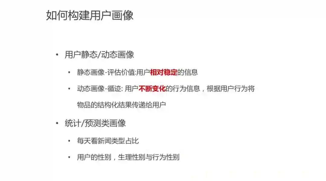 先从大维度来说,划分为动态和静态两类。比如说人口统计学的性别、年龄、地域、收入、生活习惯,是相对静态的,性别一般都不会变,年龄的话一年就涨一岁,然后地域的话也很少有大的变动,收入职业所处行业也不会有突然的变化,这些都可以划分到静态标签。而像用户访问设备、用户的48小时是否活跃、内容&商品消费偏好等属于时常在发生变动的,这些可以划入动态特征。