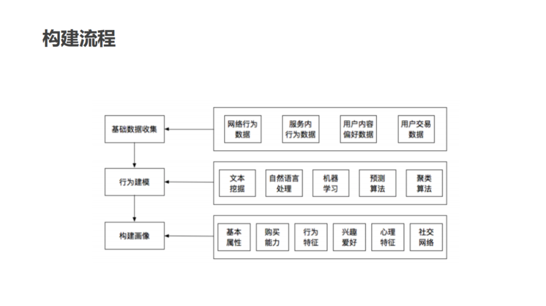 第一步是收集数据,图中方法比较多,各有优缺点,不过目前主流的还是通过用户静态数据结合海量的平台用户行为数据的方式。通过埋点,我们可以看到用户在我们平台上看了什么商品,点了什么商品买了什么商品,将这些数据串起来,可以作为入口去理解用户,更进一步,通过一些统计、概率知识进行建模,比如说用户细分、生命周期划分、流失用户研究等,做深层次的挖掘。接下来我们来解构用户画像。