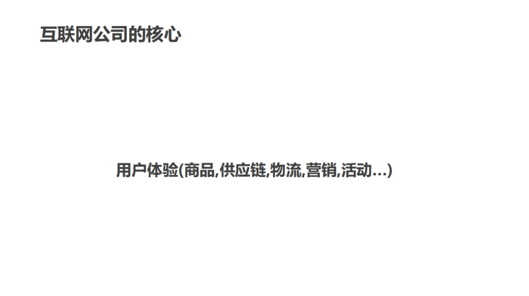 首先我们来看一下什么是互联网公司的核心。鄙人的浅见是围绕商品、供应链、物流、营销活动等的整个购物旅程背后的用户体验。