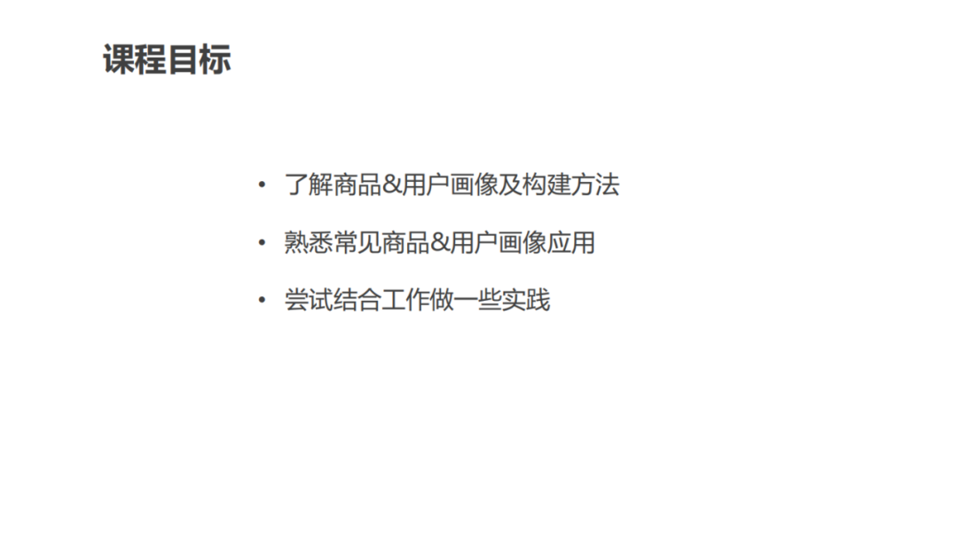 课程目标是希望通过分享,首先让大家去了解到用户画像和商品画像,整体概念框架以及构建的一些方法;熟悉常见的商品和用户画像的一些应用;尝试结合自己的工作做一些实践。出于对于过往公司数据及技术的保密,无法直接分享给大家特别细粒度且对应的数据。所以分享过程中我会结合业界的一些案例,以及其他前辈公开在网上的分享内容和数据,帮助大家去理解整个应用。