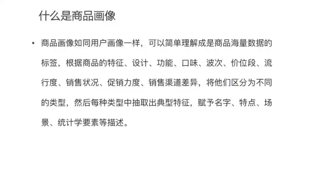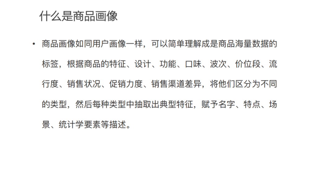 顺便介绍一下什么是商品画像,可以简单的理解为商品画像如同用户画像一样,可以简单理解成是商品海量数据的标签,根据商品的特征、设计、功能、口味、波次、价位段、流行度、销售状况、促销力度、销售渠道差异,将他们区分为不同的类型,然后每种类型中抽取出典型特征,赋予名字、特点、场景、统计学要素等描述。