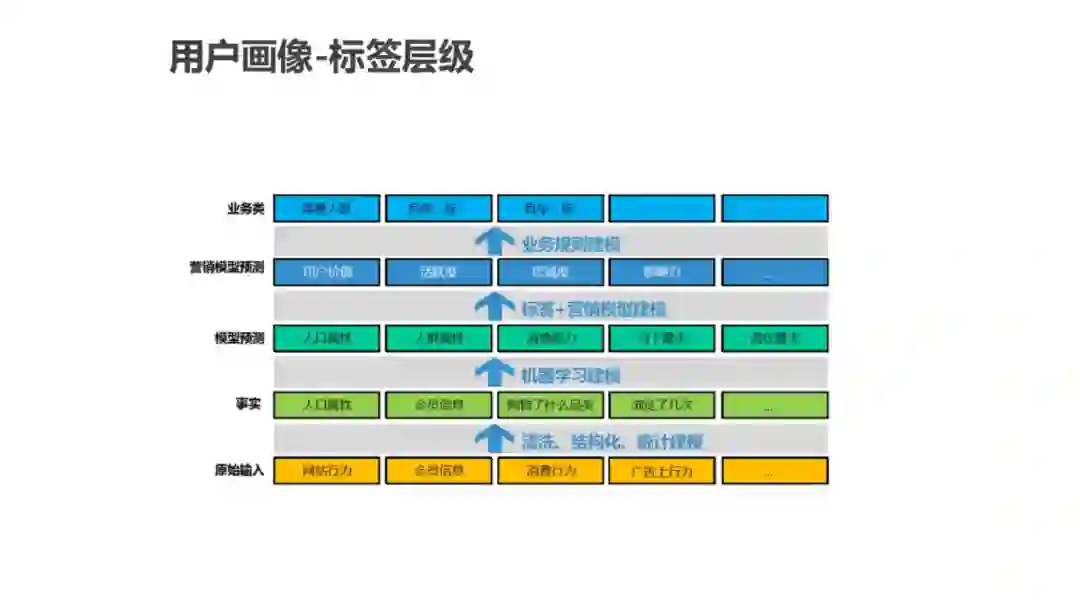 再次就是可以从层级的角度来看,用户基本属性和行为标签为浅层用户画像,这些标签画像主要是收集就行,比如年龄,性别。第二层是稍作处理的汇总层,比如手机端大概什么时间活跃,经常购买的品类等。第三层是基于前2层可以做到营销的敏感度,社交关系,上网时间的预测;最后一个是更深层的,需要结合业务知识去做定制。比如保险领域的高中低价值、贷款需求程度,风险高低等。