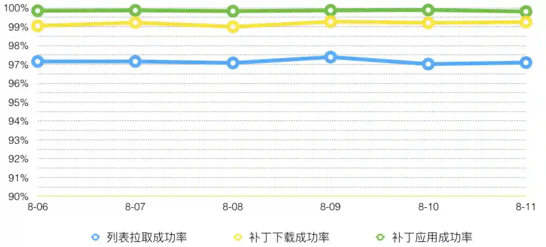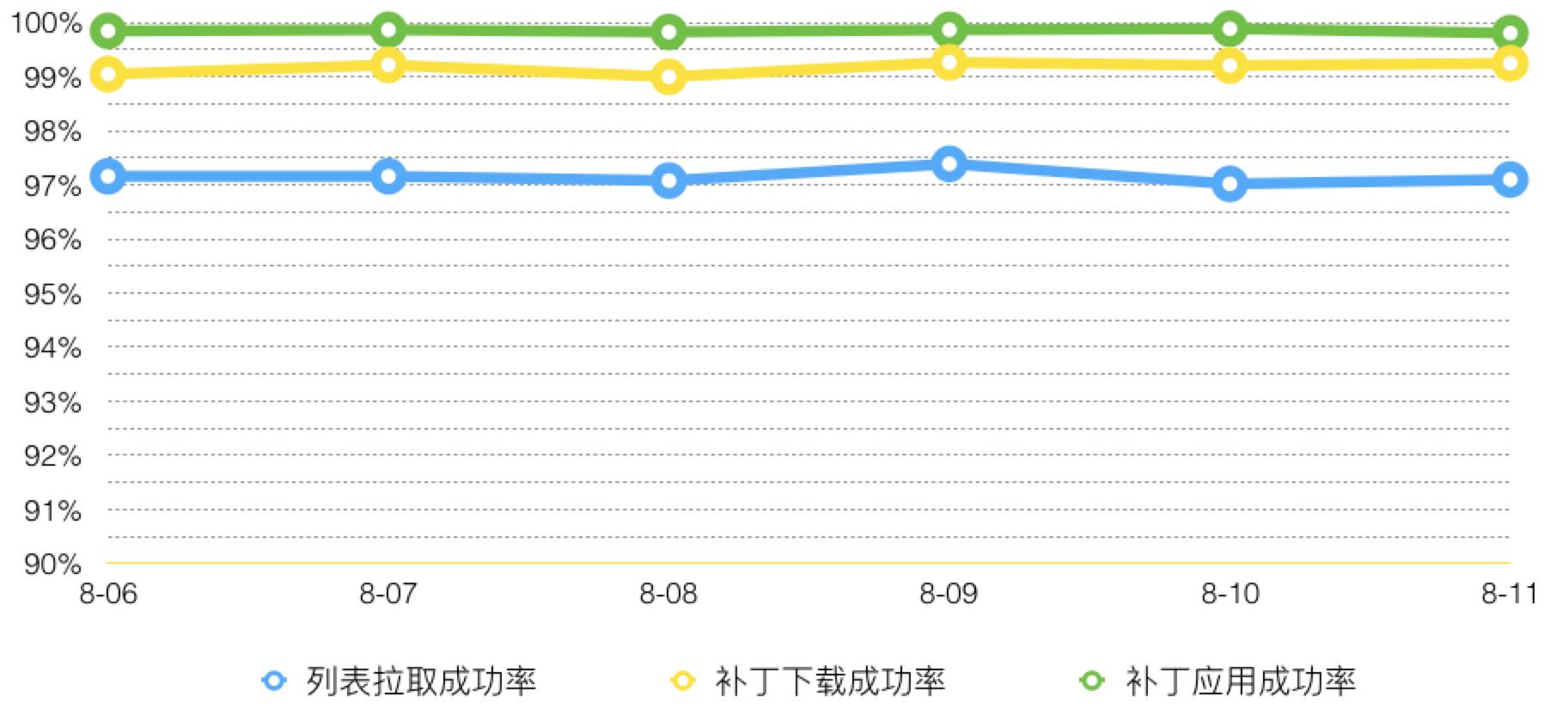 补丁的兼容性和成功率如何?通过以上的理论分析,可以看到这套实现基本没有兼容性问题,实际上线的数据如下: