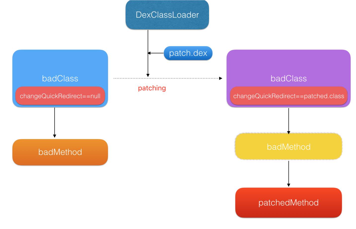 客户端拿到含有PatchesInfoImpl.java和StatePatch.java的patch.dex后,用DexClassLoader加载patch.dex,反射拿到PatchesInfoImpl.java这个class。拿到后,创建这个class的一个对象。然后通过这个对象的getPatchedClassesInfo函数,知道需要patch的class为com.meituan.sample.d(com.meituan.sample.State混淆后的名字),再反射得到当前运行环境中的com.meituan.sample.d class,将其中的changeQuickRedirect字段赋值为用patch.dex中的StatePatch.java这个class new出来的对象。这就是打patch的主要过程。通过原理分析,其实Robust只是在正常的使用DexClassLoader,所以可以说这套框架是没有兼容性问题的。