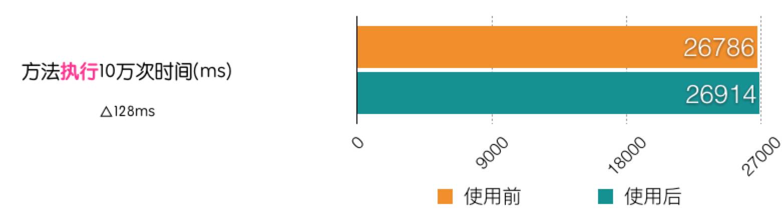 从图中可以看到,对一个只有内存运算的函数,处理前后分别执行10万次的时间增加了128ms。这是在华为4A上的测试结果。