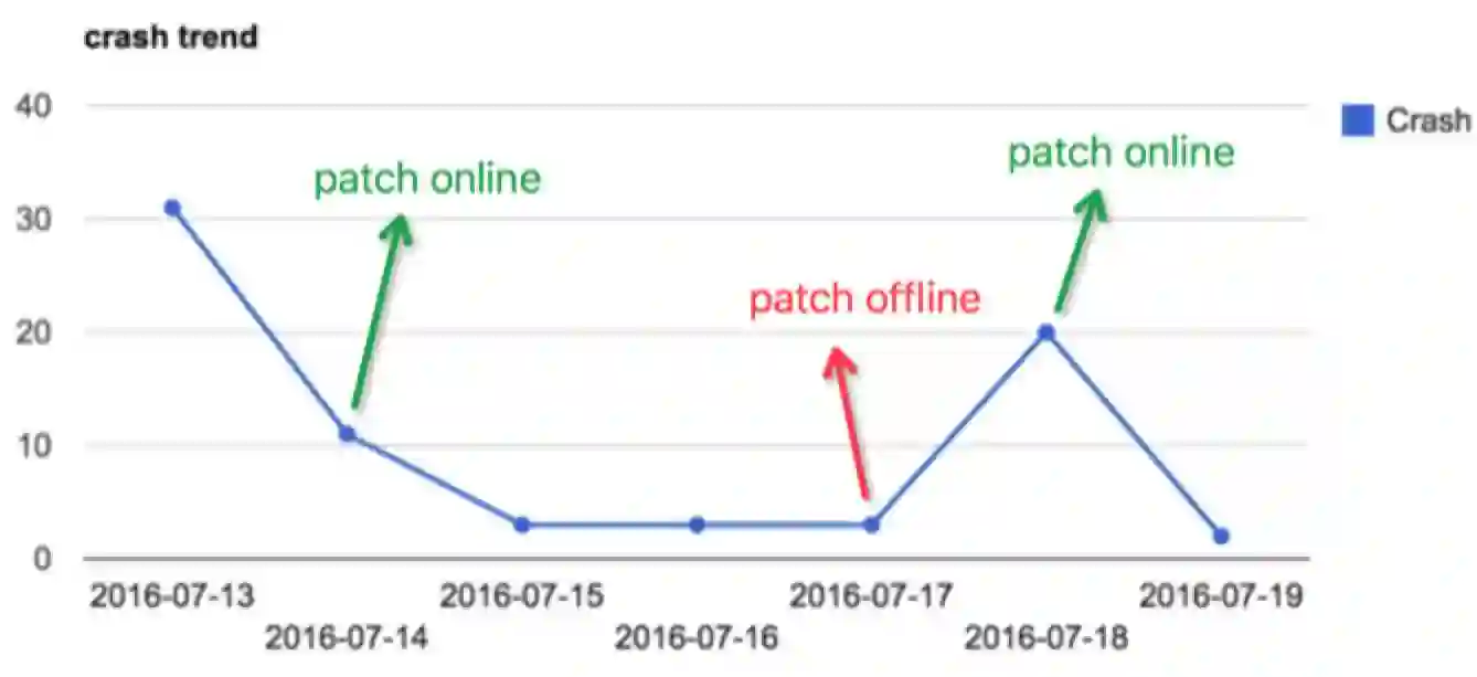 通过这个表能够看出,我们的patch信息拉取的成功最低,平均97%多,这是因为实际的网络原因,而下载成功后的patch成功率是一直在99.8%以上。而且我们做的是无差别下发,服务端没有做任何针对机型版本的过滤,线上的结果再次证明了Robust的高兼容性。