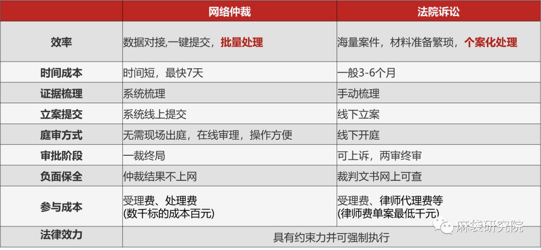 据上表可知,相对法院诉讼,新出现的网络仲裁在时间成本、人力成本等方面有压倒性优势。在保证同等法律效力的前提下,网络仲裁确实提供了一个更高效的路径去解决纠纷。