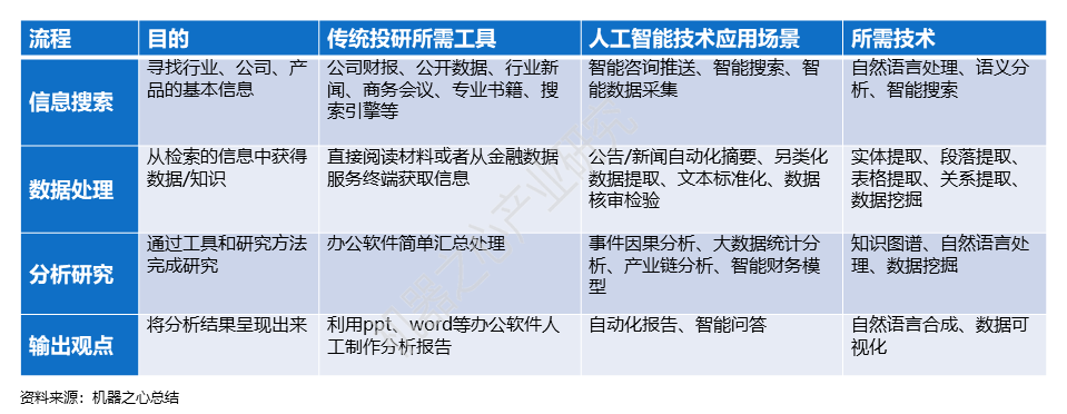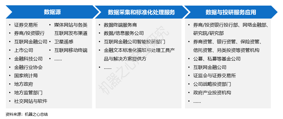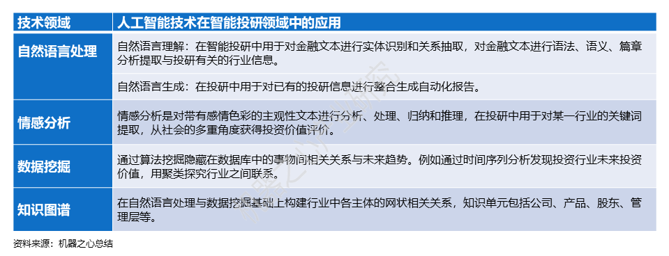 由于智能投研更侧重投资端,其服务B端客户积累得到的更规范的投资理念、更标准化的投资策略、更深度的智能算法技术运用经验等优势,也逐步为作为前端顾问的智能投顾提供后台支持。虽然二者应用的数据类型与技术类似,但服务内容与目标完全不同,在中国同属于投资咨询业务。