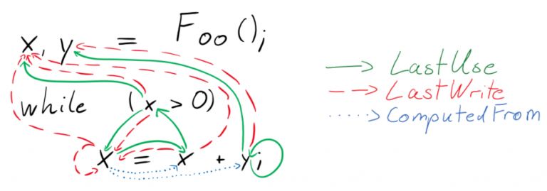 LastUse 关系以绿色边缘显示。因此,例如,y 与循环之前的 y 的最后一次使用以及自身相关联。同样,LastWrite 关系显示为红色边,因此在 while 条件中使用 x 与循环前的 x 赋值,以及循环内 x 的赋值相关联。最后,ComputedFrom 关系由蓝色边缘表示,将变量连接到从中计算出来的变量。