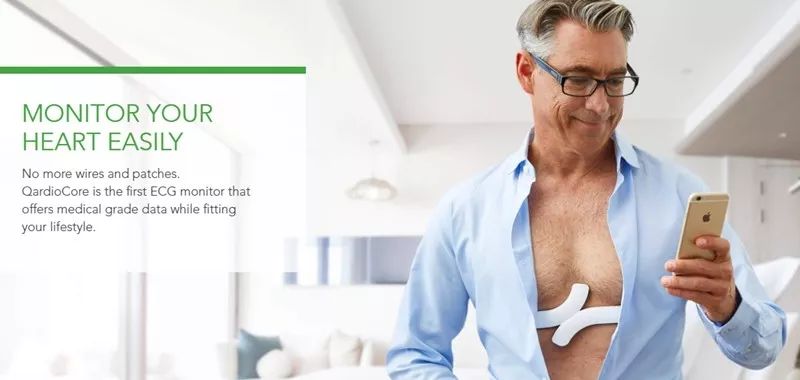 随着传感器技术的发展,心电监测也变得越来越方便。2015年,Qardio公司推出了无线心电监测设备QardioCore,无需传统心电图监测的导线和粘性贴片。只需将该胸带围绕胸部卡住即可。用户通过手机就可以查看心电图、心率等指标。