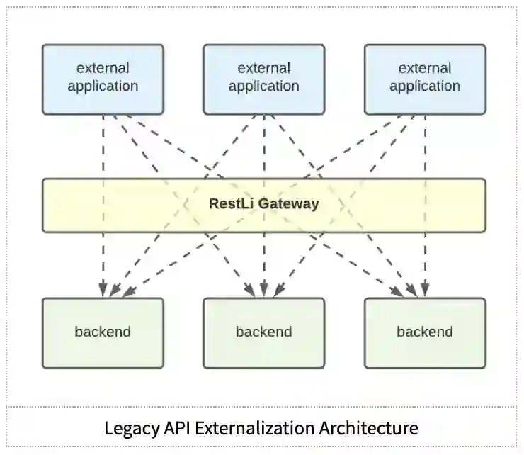 遗留的架构由各种业务线构建的后端 API 组成,并通过 Rest.liAPI 网关对外公开。由于这些 API 没有版本控制,所有为内部 API 实现的东西都会直接暴露给外部用户。