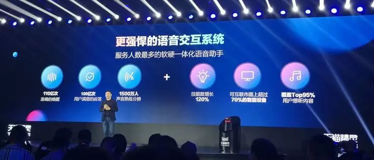 “在过去18个月中,天猫精灵完成了110亿次语音唤醒,回答了用户100亿个问题,并且能够分辨出1500万用户声音,技能增长120%,可互联市面上70%以上智能设备,覆盖Top95%的语音内容。”